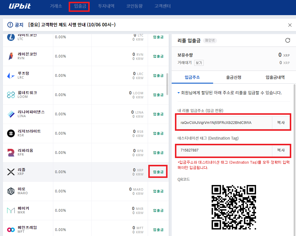 업비트 입출금에 들어가 리플 입금주소와 태그를 복사해주세요